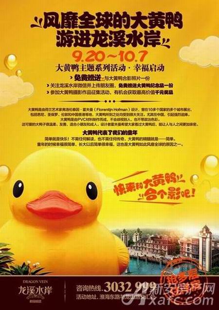 本次活動(dòng)時(shí)間將從9月20日持續(xù)到10月7日,國(guó)慶期間不用外出也能與大黃鴨親密接觸。同時(shí),海容龍溪水岸大黃鴨主題系列活動(dòng)幸福啟幕,來(lái)訪客戶(hù)可免費(fèi)贈(zèng)送與大黃鴨親密合影照片一份。參加大黃鴨攝影作品征集活動(dòng),還有機(jī)會(huì)獲取最高價(jià)值千元獎(jiǎng)品。